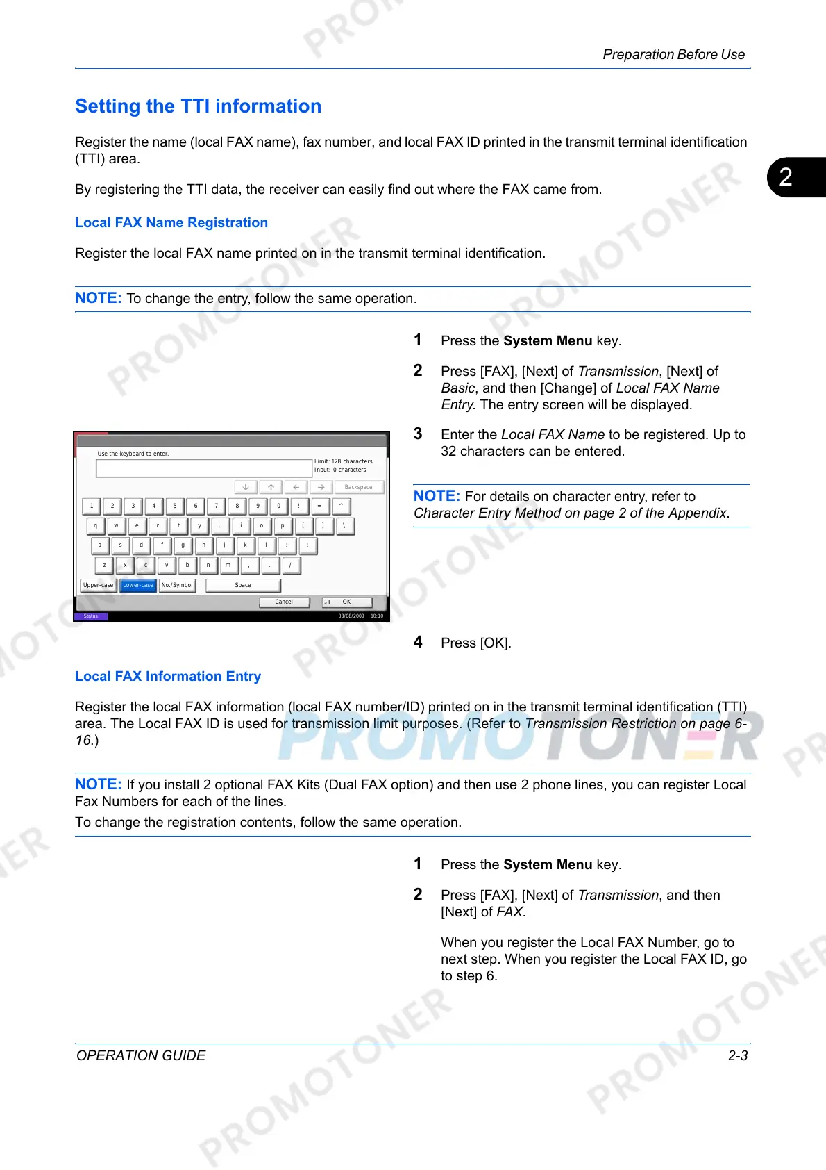 area. The Local FAX ID is used for transmission limit purposes. (Refer to Transmission Restriction on page 6-