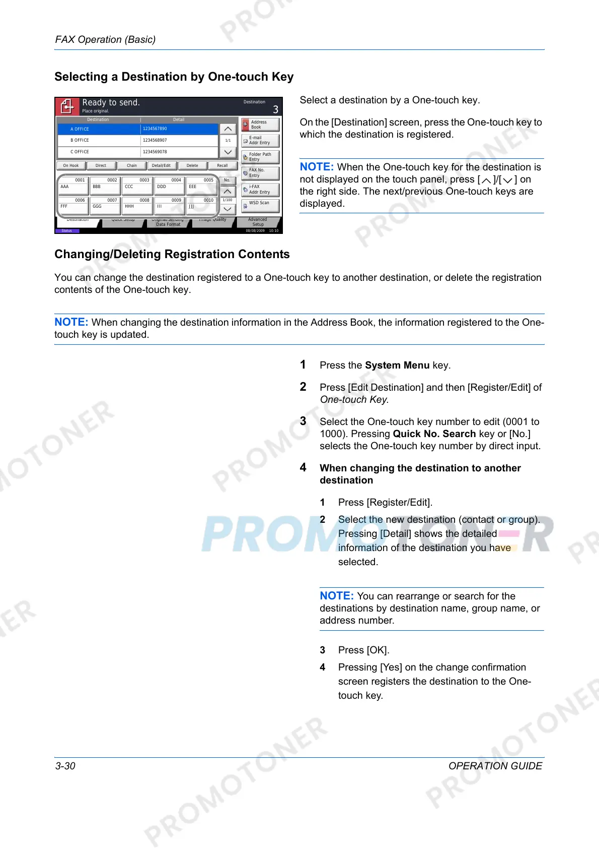 NOTE: When changing the destination information in the Address Book, the information registered to the One-