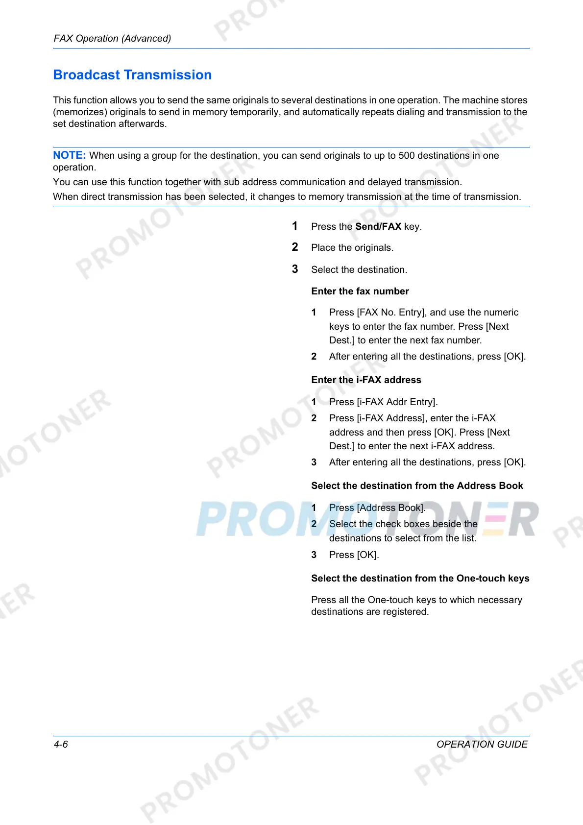 This function allows you to send the same originals to several destinations in one operation. The machine stores