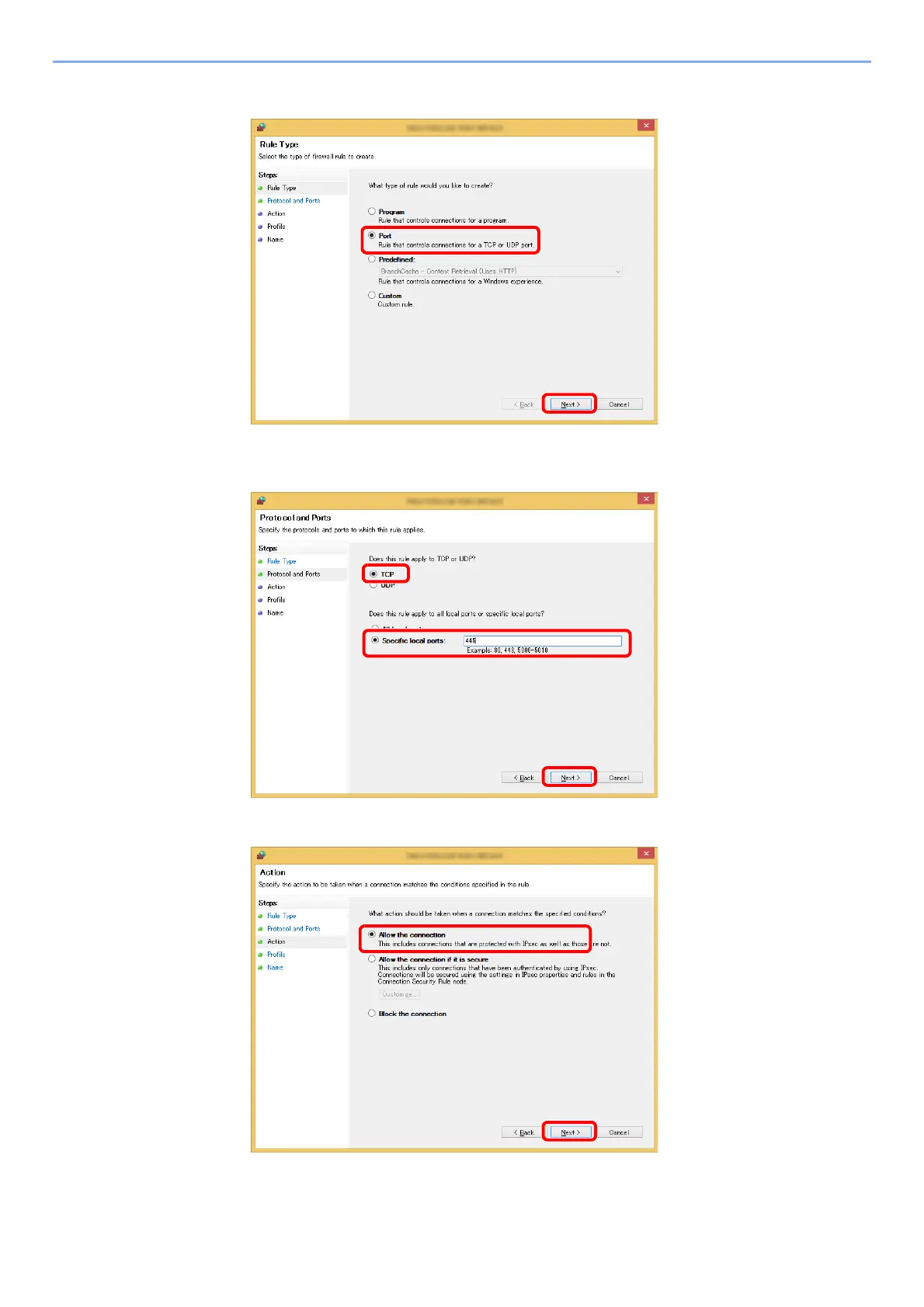 6 Select [TCP] as the port to apply the rule to. Then select [Specific local ports] and enter