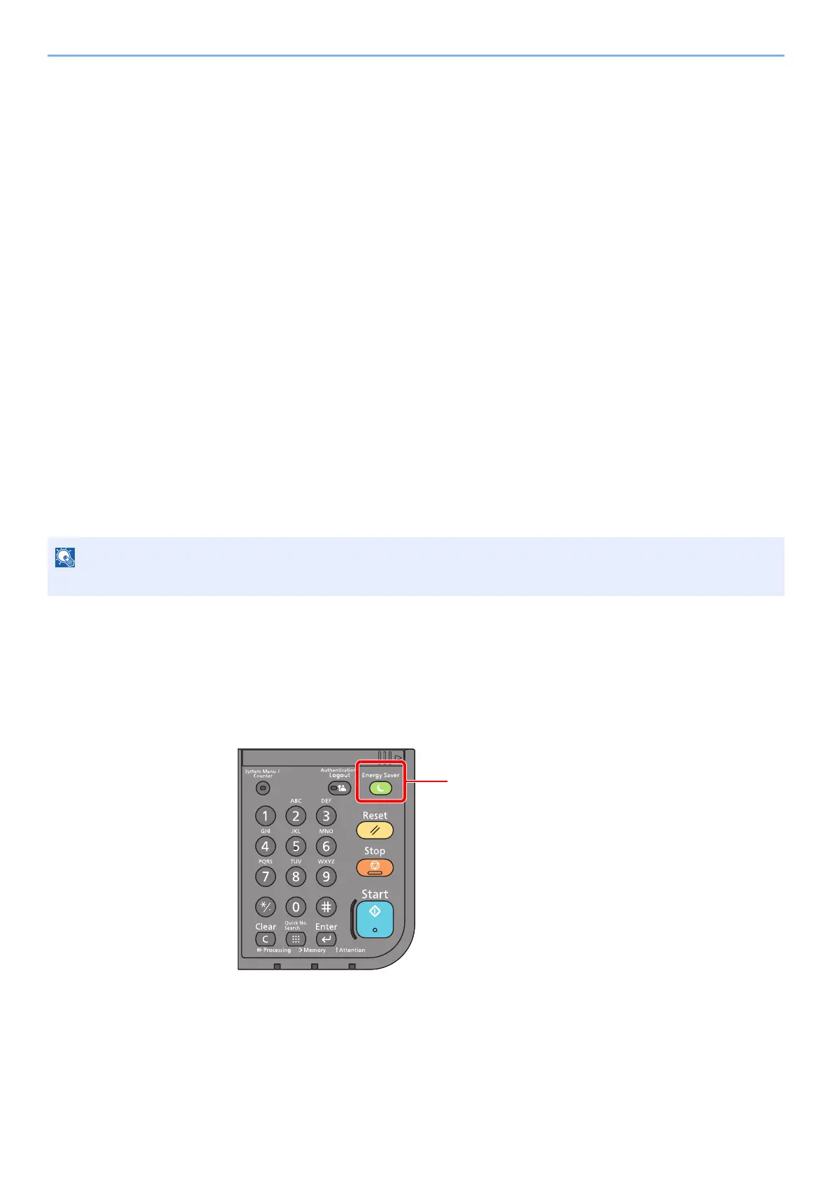 To enter Sleep, select the [Energy Saver] key. Touch panel and all indicators on the operation panel will go out to save