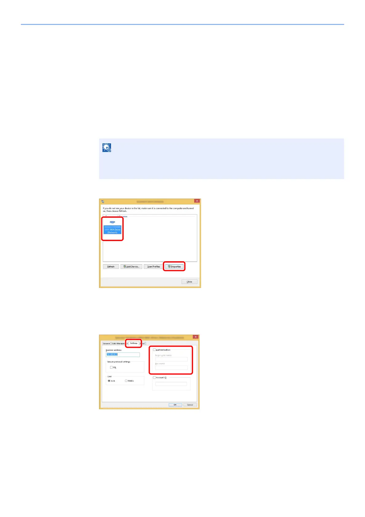 To manage the users that scan using WIA, the following settings are necessary in the WIA driver. Instructions are based