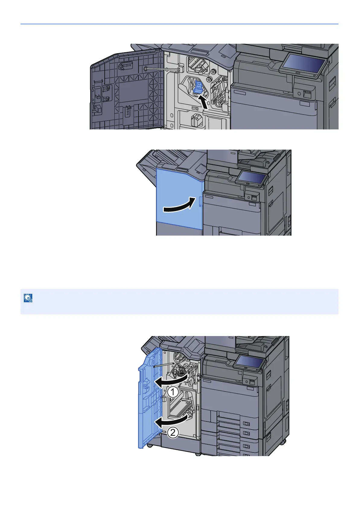 Open the finisher front cover 1 and 2.