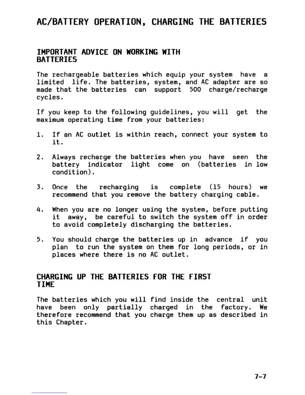 Olivetti M15 Plus - Important Advice on Working with Batteries; CHARGING up the BATTERIES for the First TIME