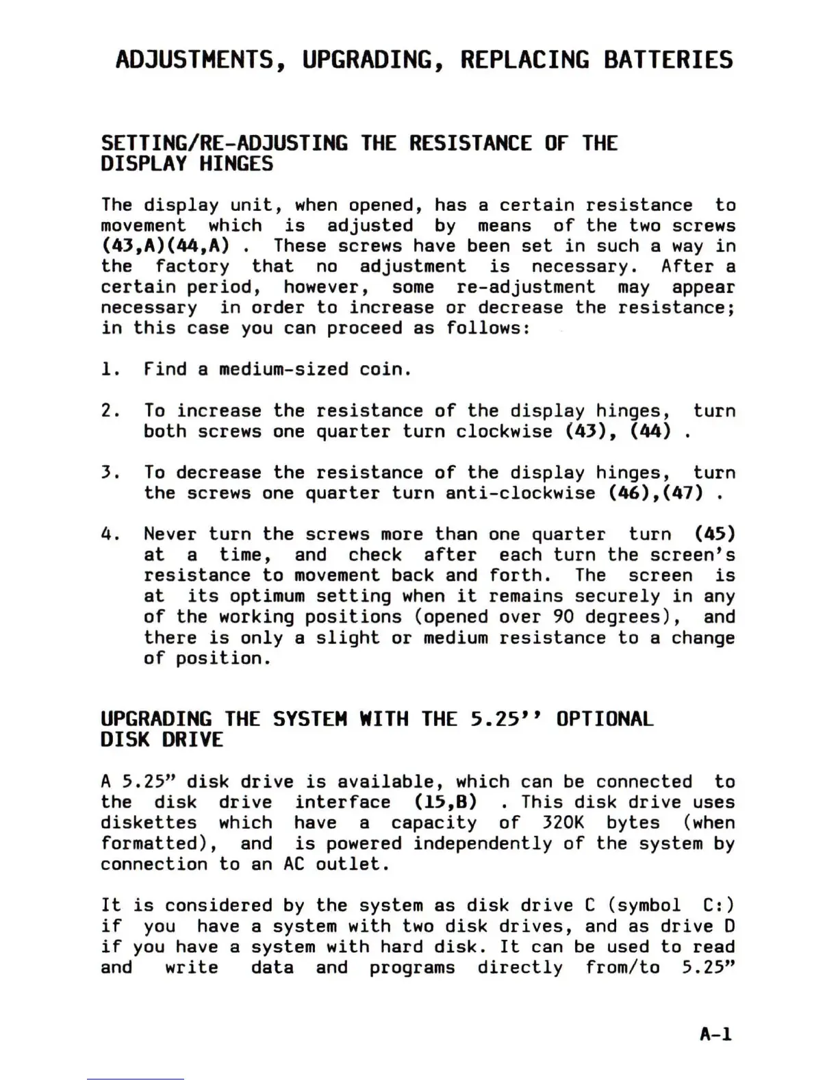 Olivetti M15 Plus - Adjustments, Upgrading, Replacing Batteries; Disk Drive