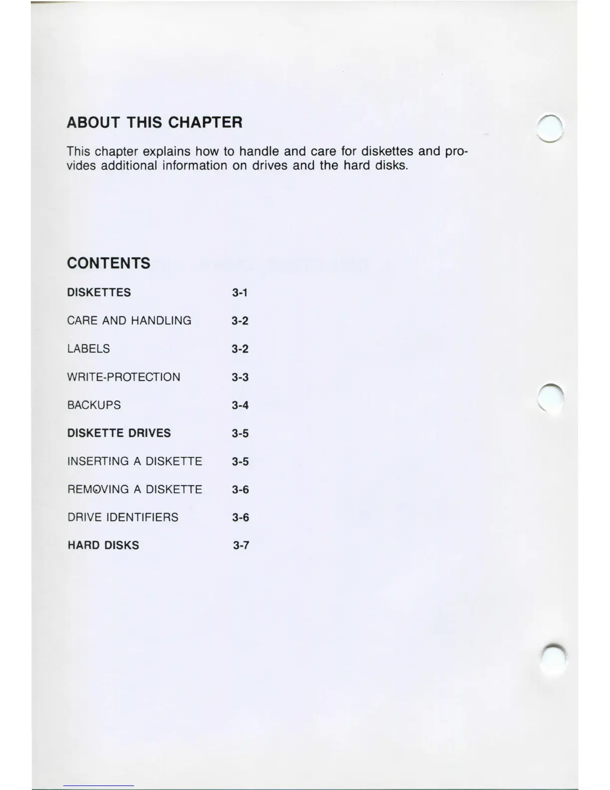 This chapter explains how to handle and care for diskettes and pro-