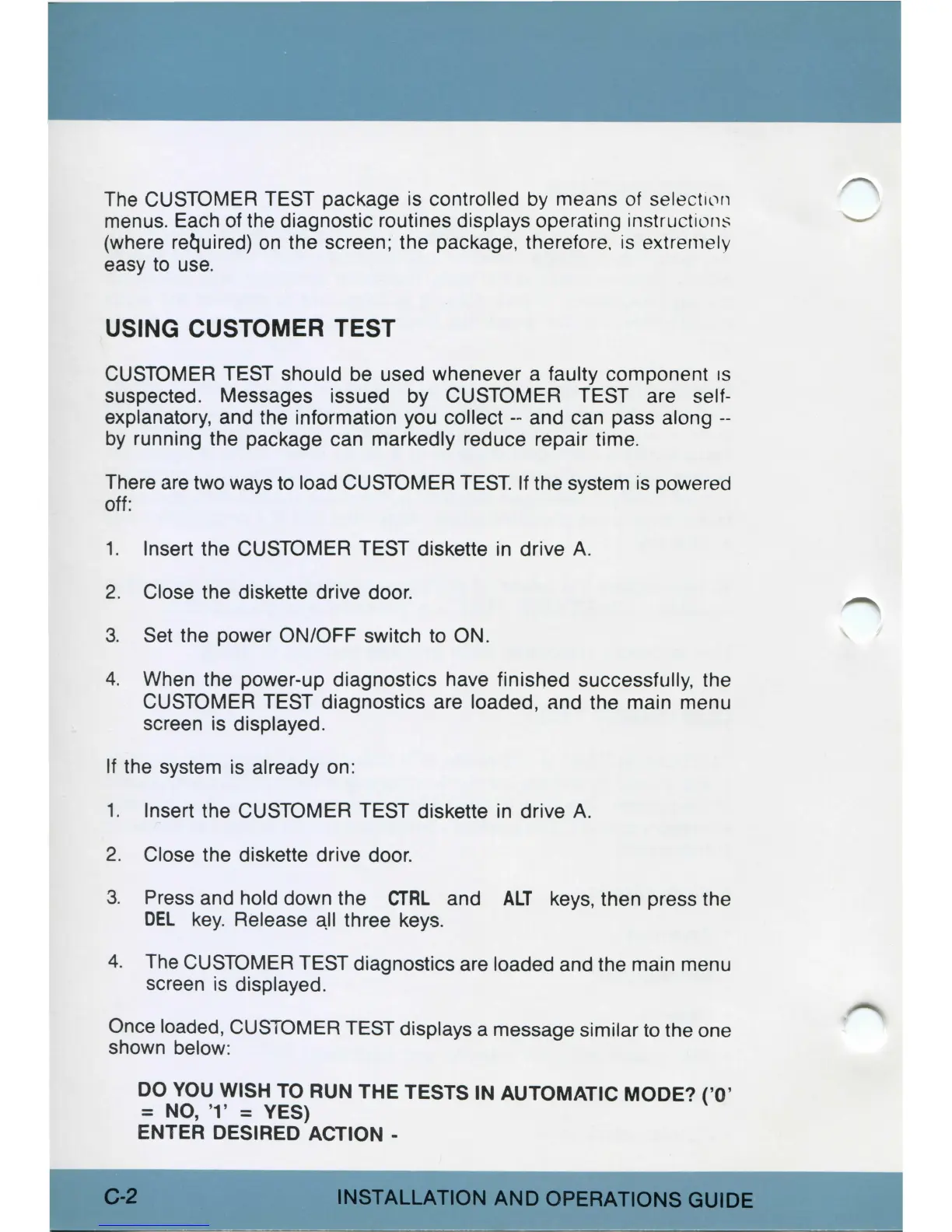 4. The CUSTOMER TEST diagnostics are loaded and the main menu