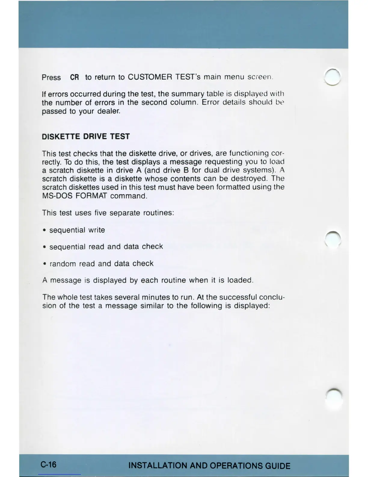 This test checks that the diskette drive, or drives, are functioning cor-