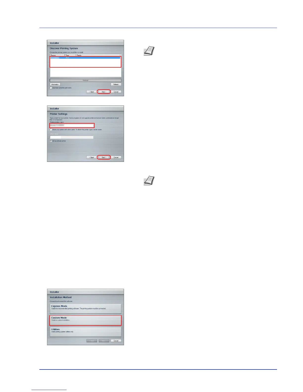 Use Custom Mode if you want to specify the printer port and select the software to be installed.
