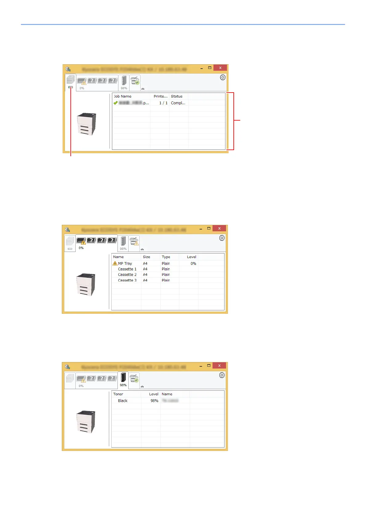 Olivetti PGL2540 - Printing Progress Tab; Paper Tray Status Tab; Toner Status Tab