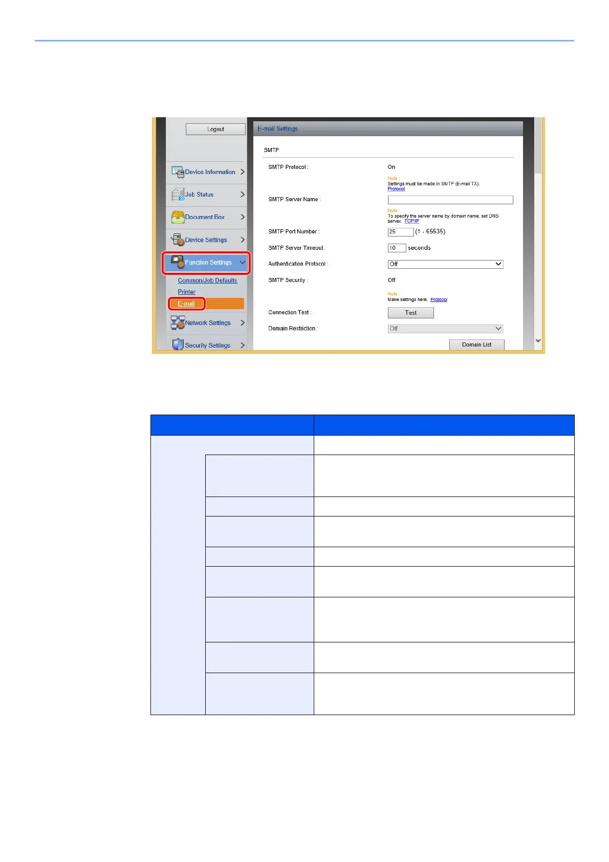 From the [Function Settings] menu, click [E-mail].
