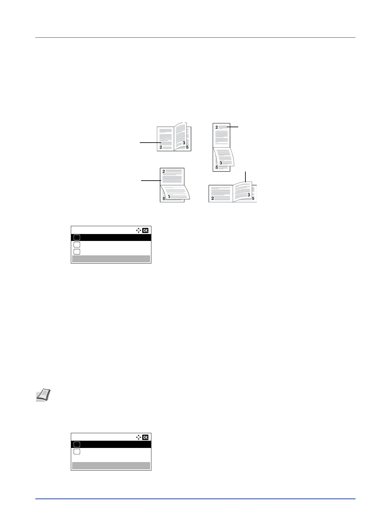 Depending on the binding type and print orientation, the duplexer provides four types of binding. These are: (1) portrait, Bind