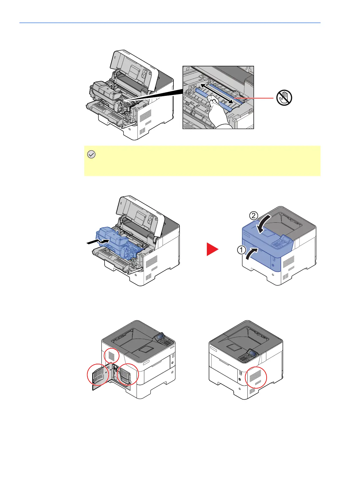 Be careful not to touch the black transfer roller and brown transfer belt during
