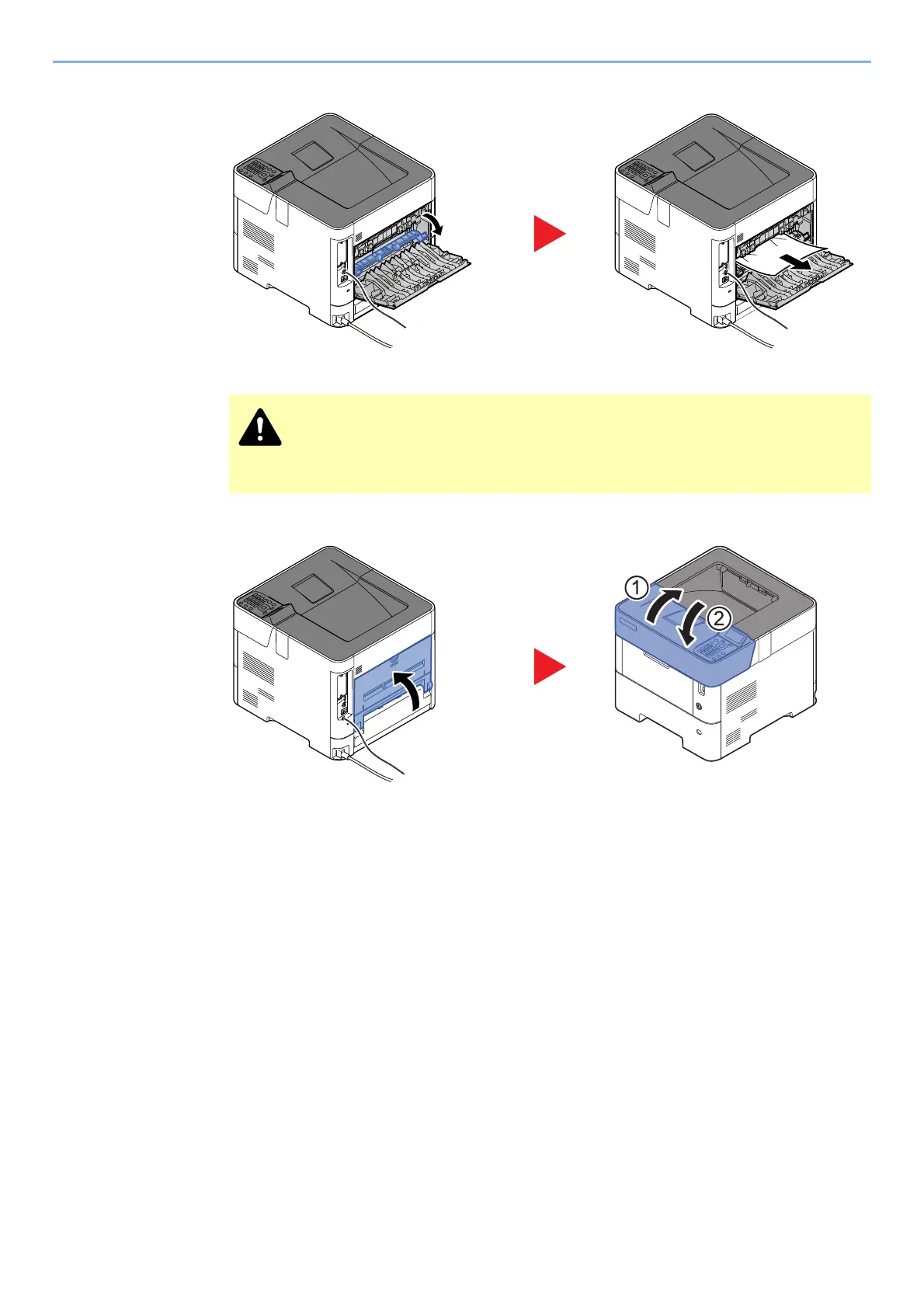 The fixing unit is extremely hot. Take sufficient care when working in this area, as
