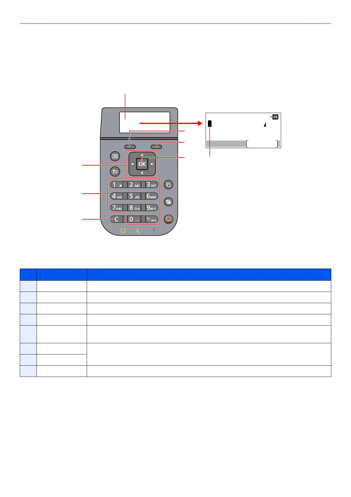 5 [OK] key Select to finalize entry and return to the screen before the entry. To enter a symbol, select to confirm