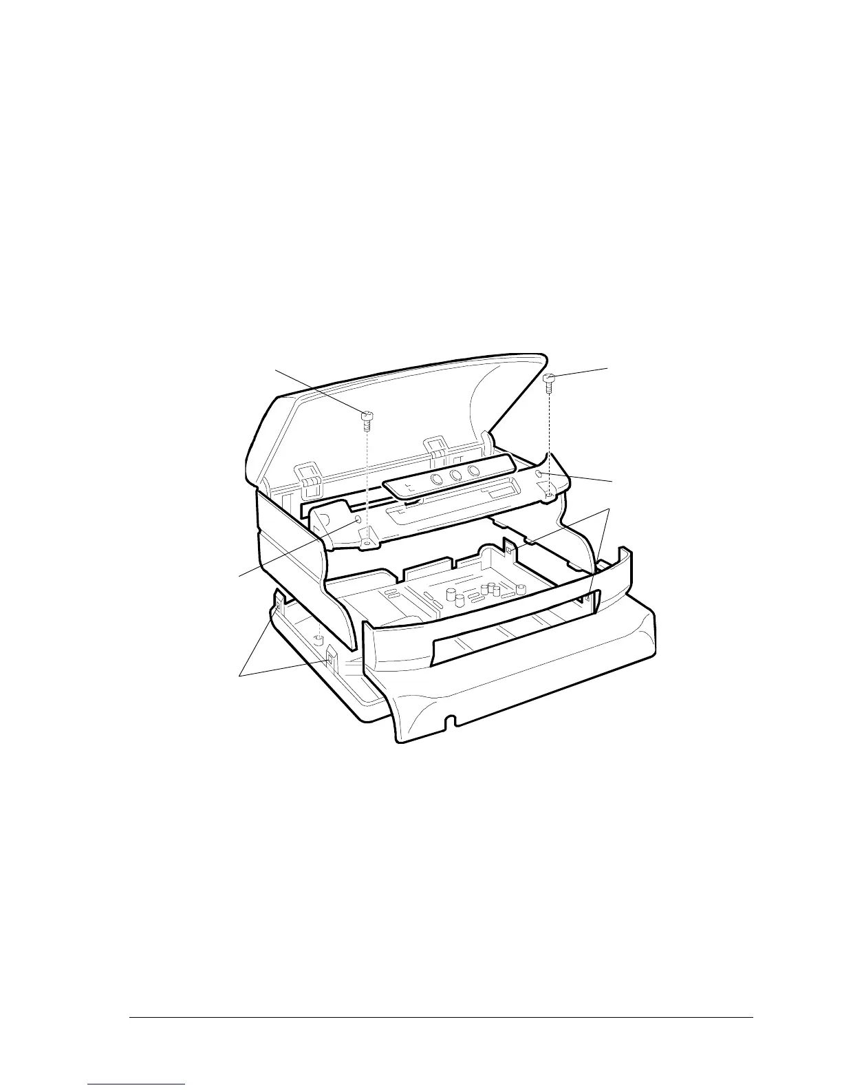 - Press the four securing tabs (3) to release the case and then partly slide it off the base of the printer