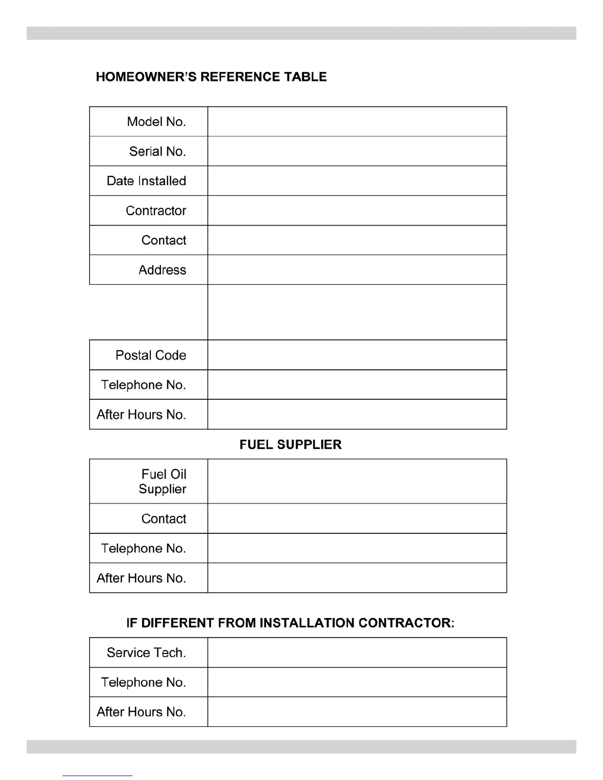 HOMEOWNER'S REFERENCE TABLE