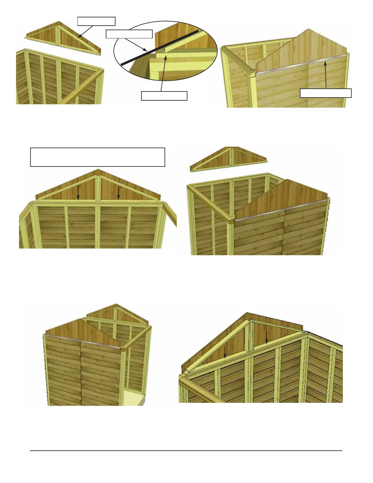 29. Temporarily attach gable walls to top plate with 2 - 2” screws (Part E). Screw from the bottom