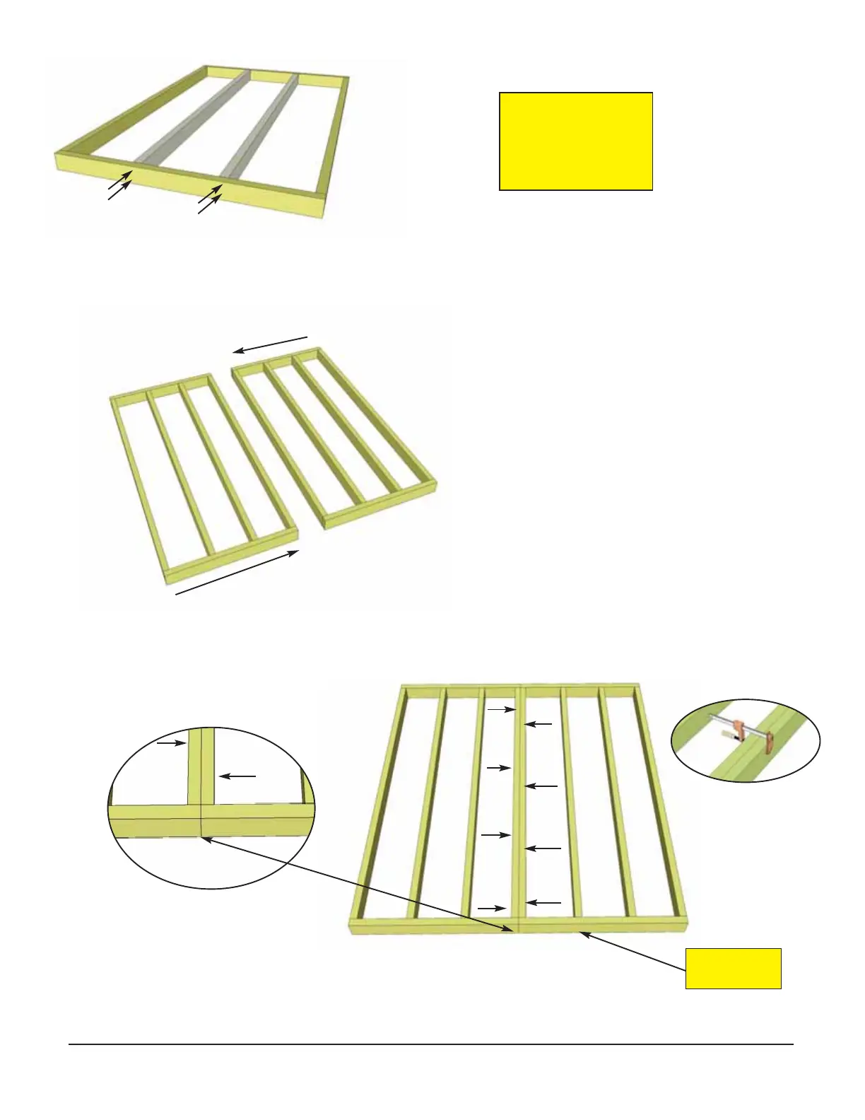 4. Align Floor Frames together as shown below. Screw sections together with 8 - 2 1/2” screws (Part B).