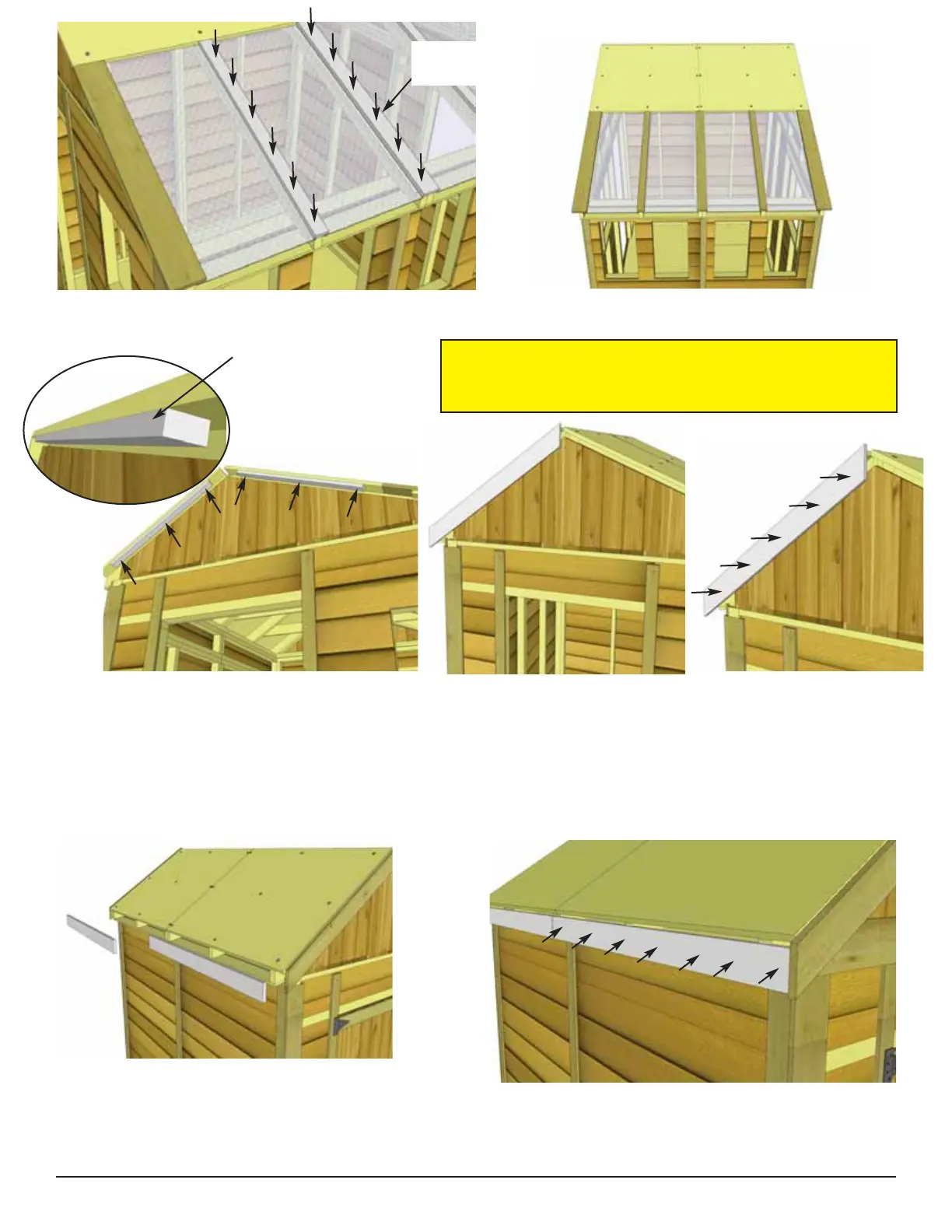 Starting with the Short Roof side, attach Front and Rear Facia (3/4” x 3 1/2” x 38 3/4” angle cut on