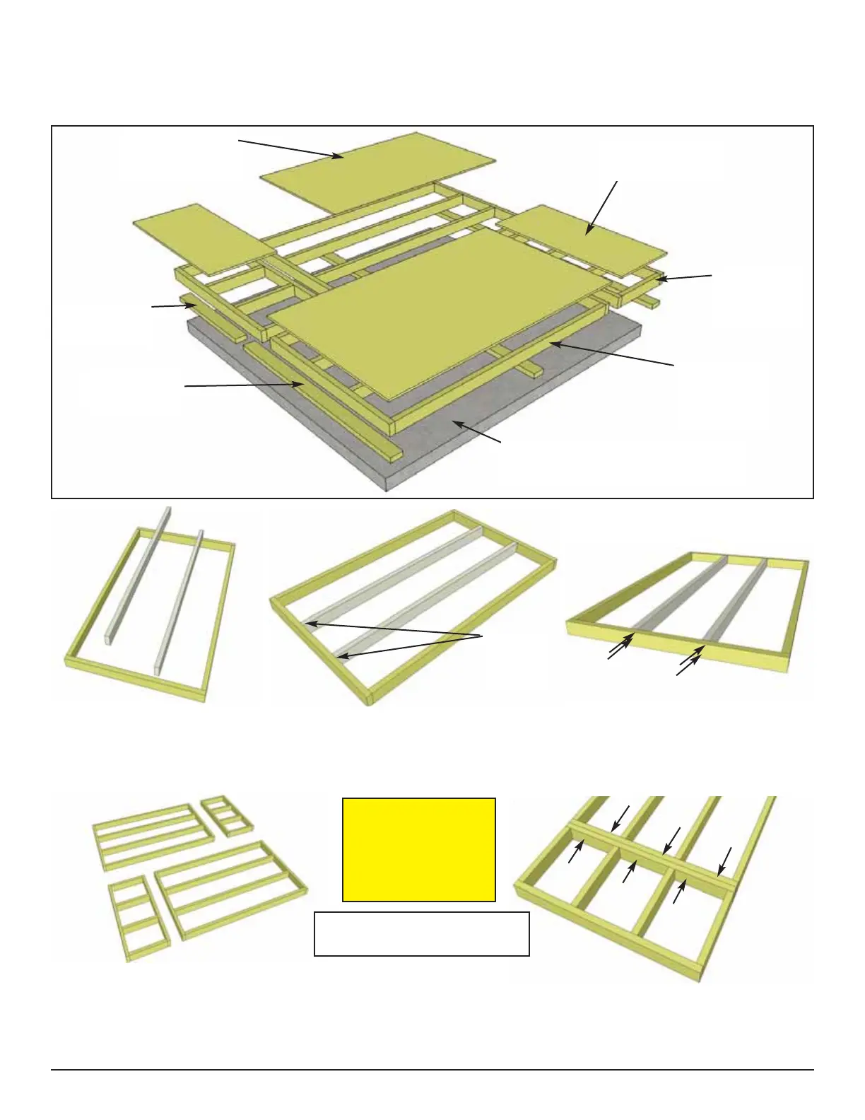 1. Lay out Large Floor Joist Frame and 2 Floor Joists. Position Joists equally in Floor Joist Frame.