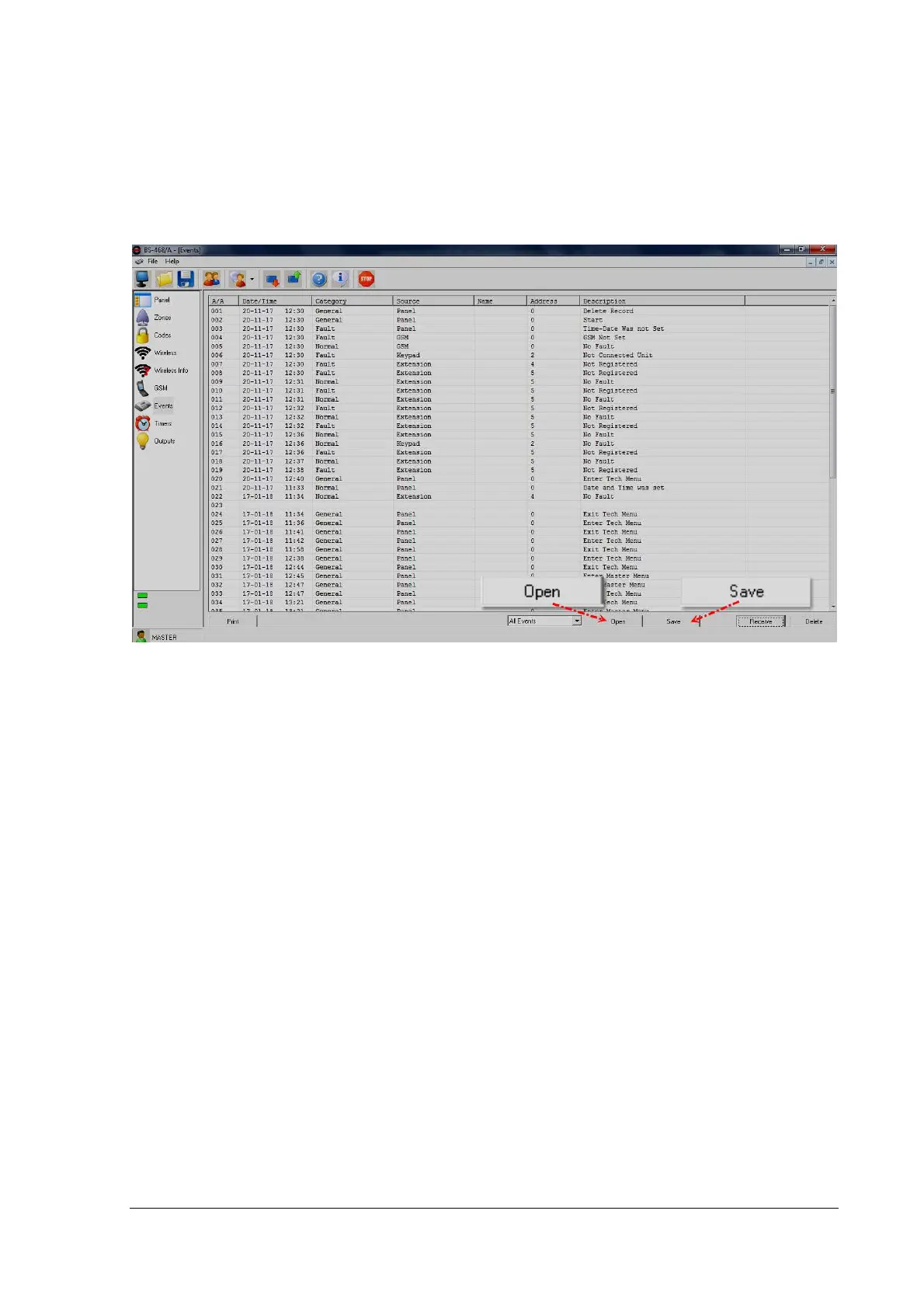 The "Open" button is used to load an event file.