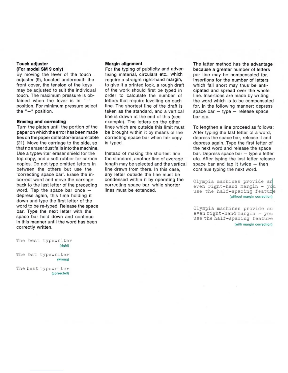 Olympia SM - Erasing and Correcting; Maintenance and Care; Touch Adjuster; Margin Alignment