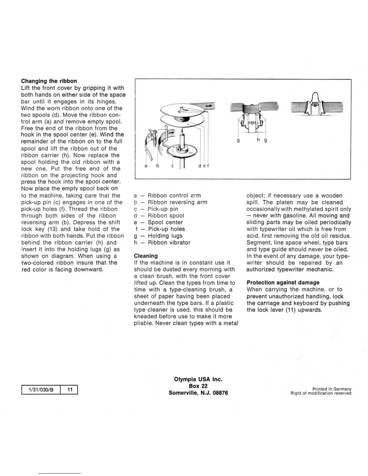 Olympia SM - Changing the Ribbon; Cleaning; Safety and Protection; Protection Against Damage