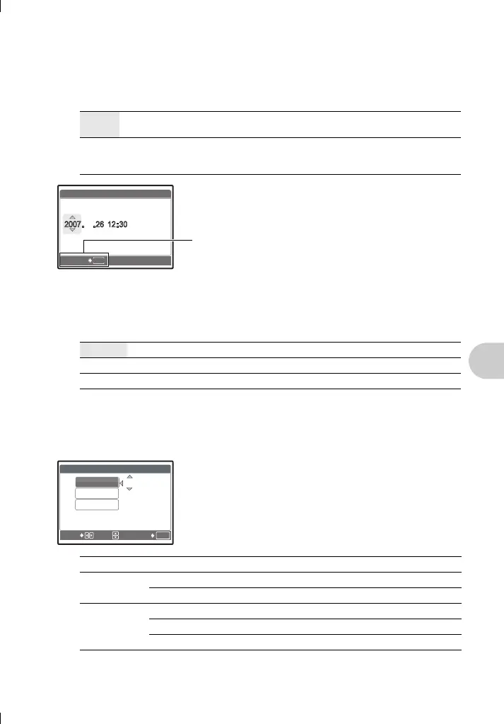 • To set the time precisely, with the cursor at either “minute” or [Y/M/D], press e as the