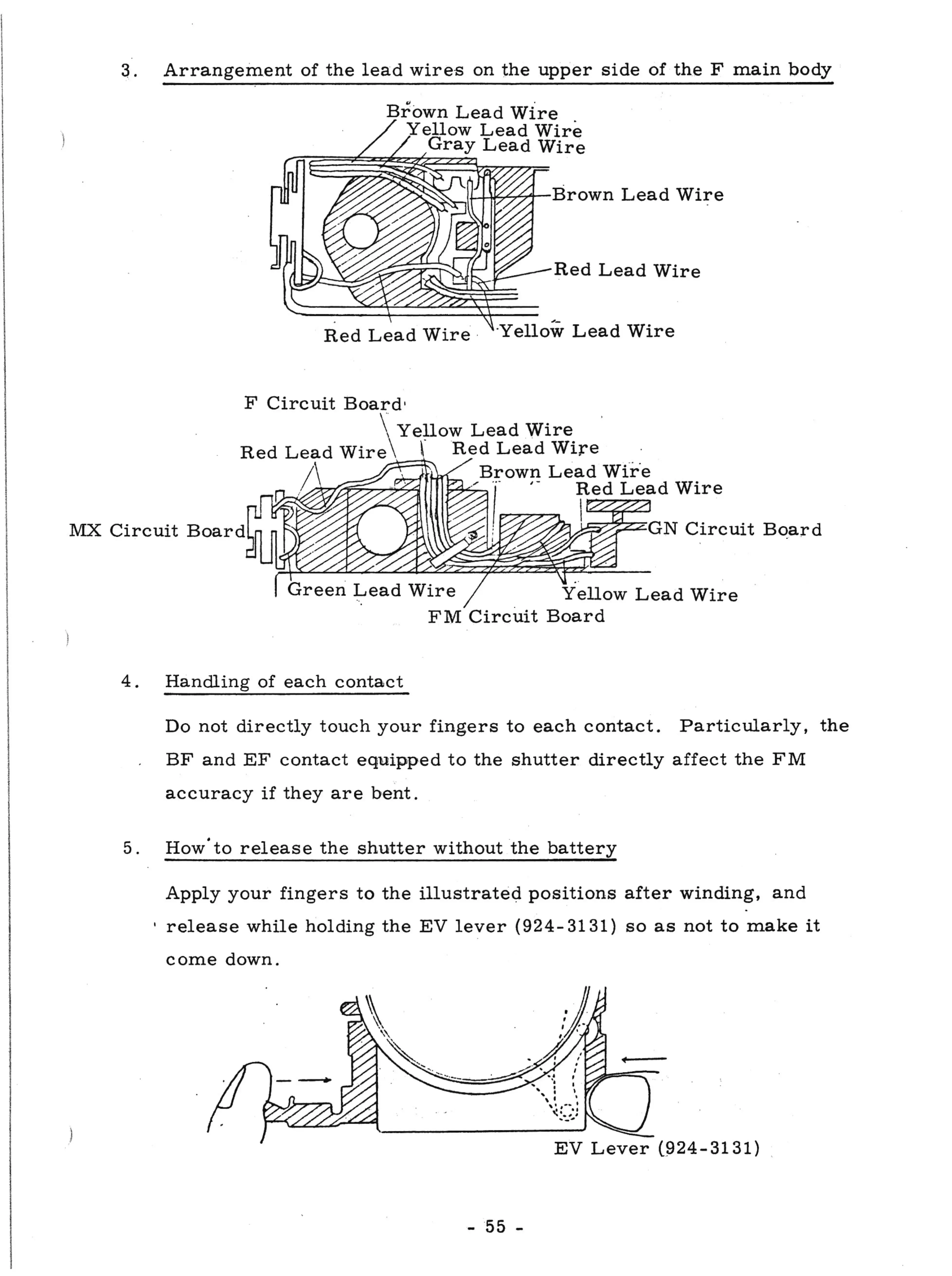Olympus 35 DC - Arrangement of the Lead Wires on the Upper Side of the F Main Body; Handling of each Contact; How to Release the Shutter Without the Battery