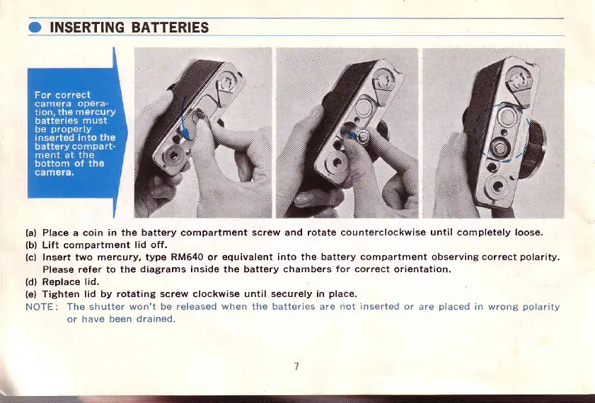 Olympus 35ECR - Inserting Batteries; Opening Battery Compartment; Securing Battery Compartment; Battery Installation Note