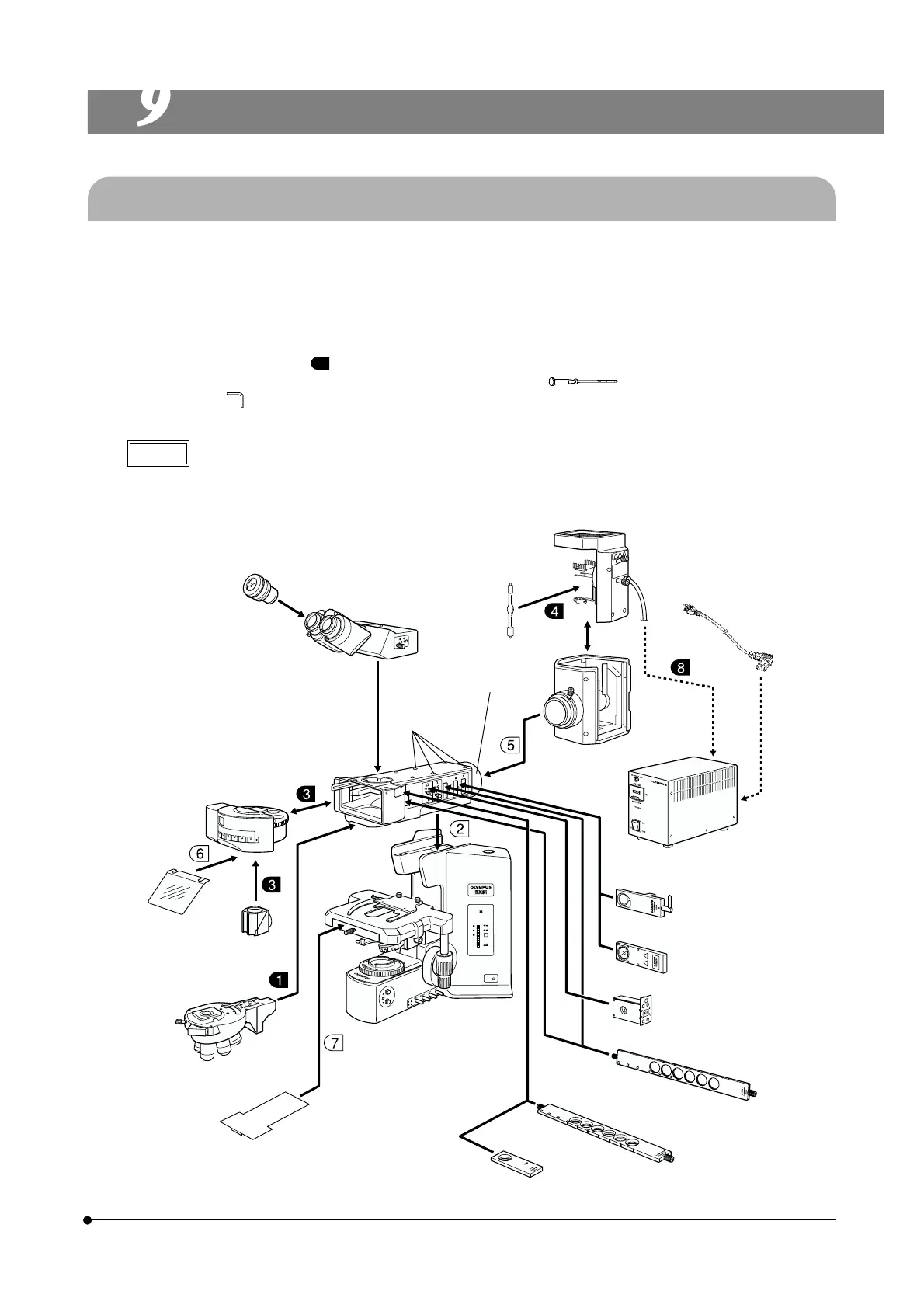 }All assembly operations are possible by using the Allen screwdriver ( ) provided with the microscope. The