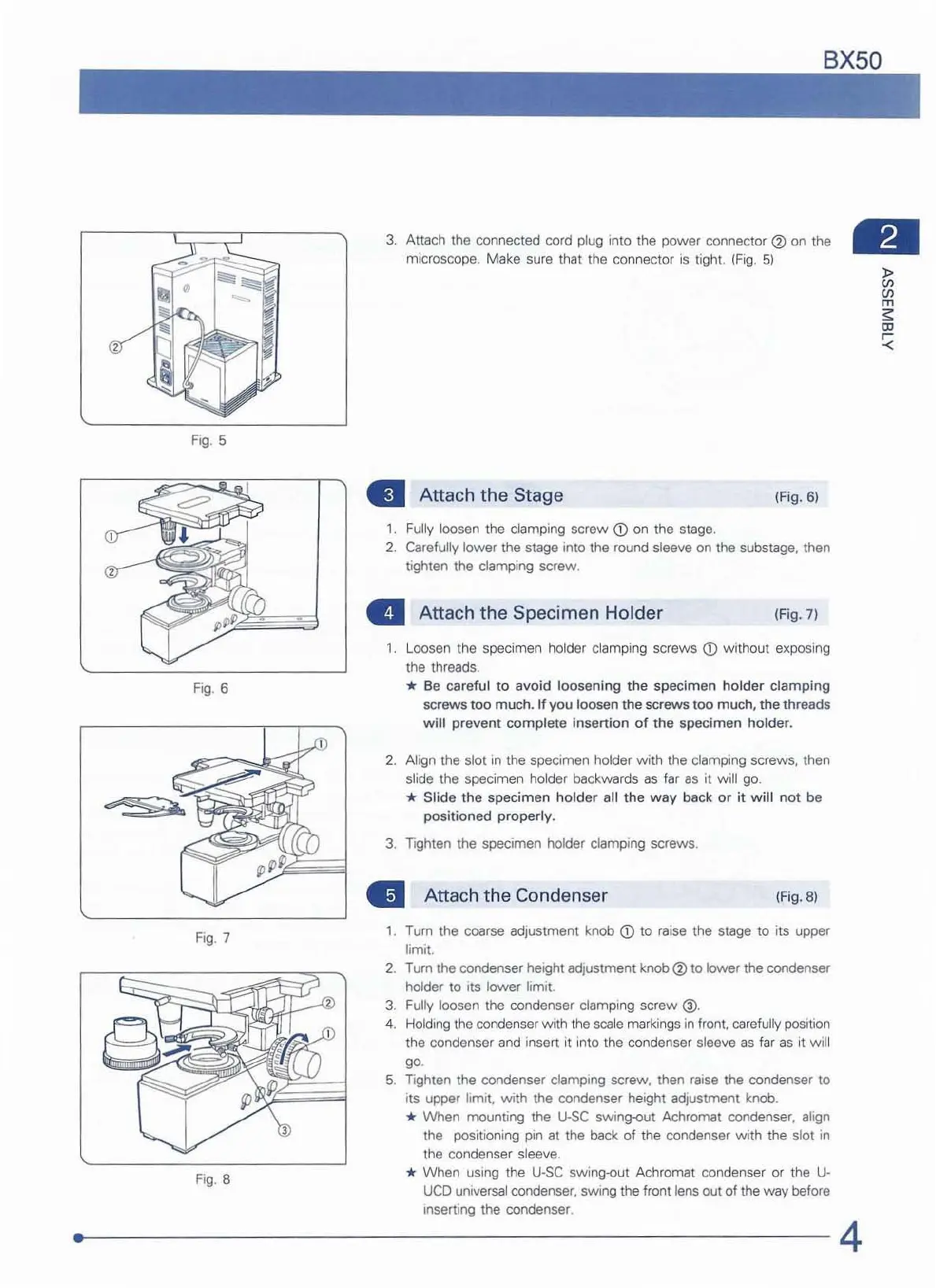 Tighten the condenser clamping screw, then raise the condenser to