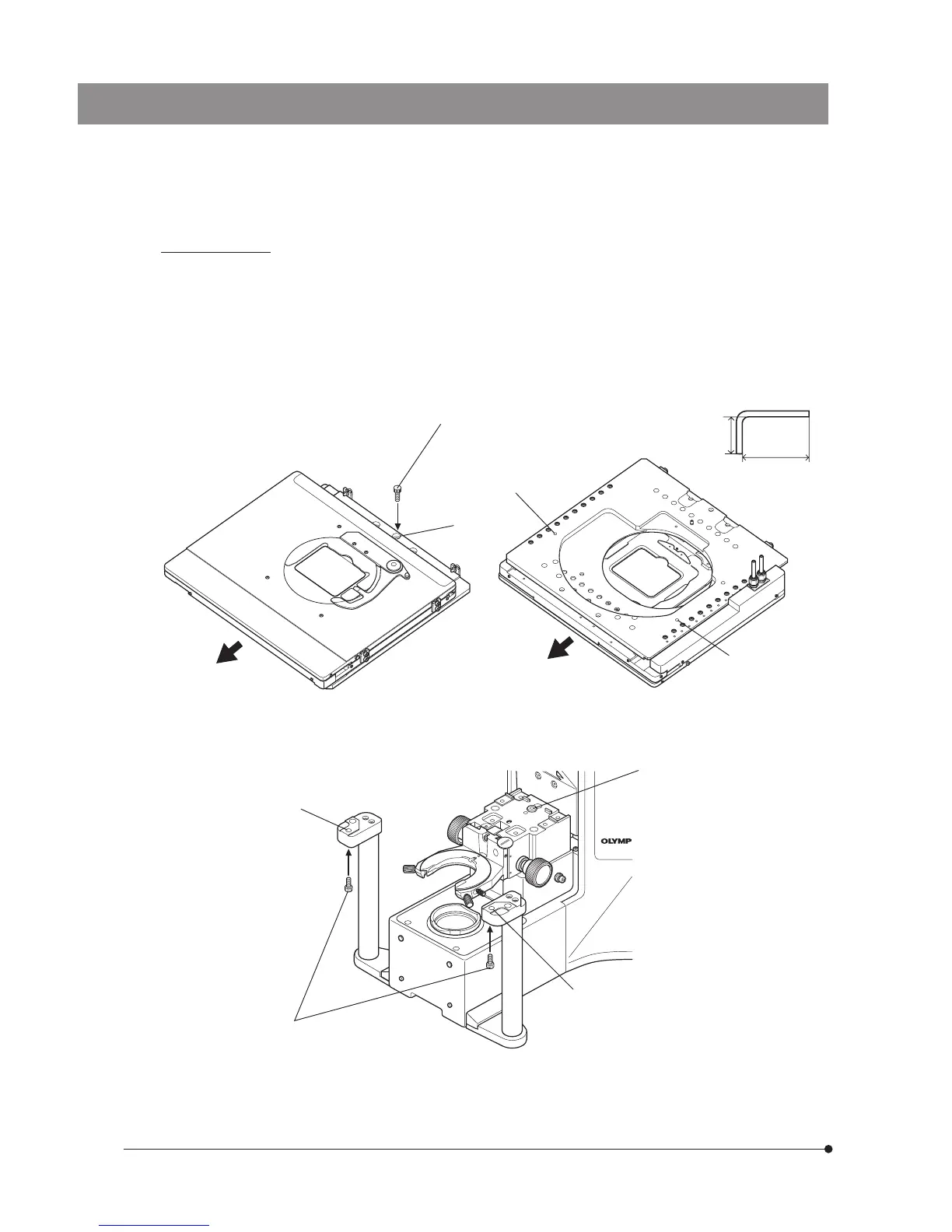 3. Tighten the screw holes 2 and 3 with the clamping screw (attached with BX63) from the lower side of the stage fixing