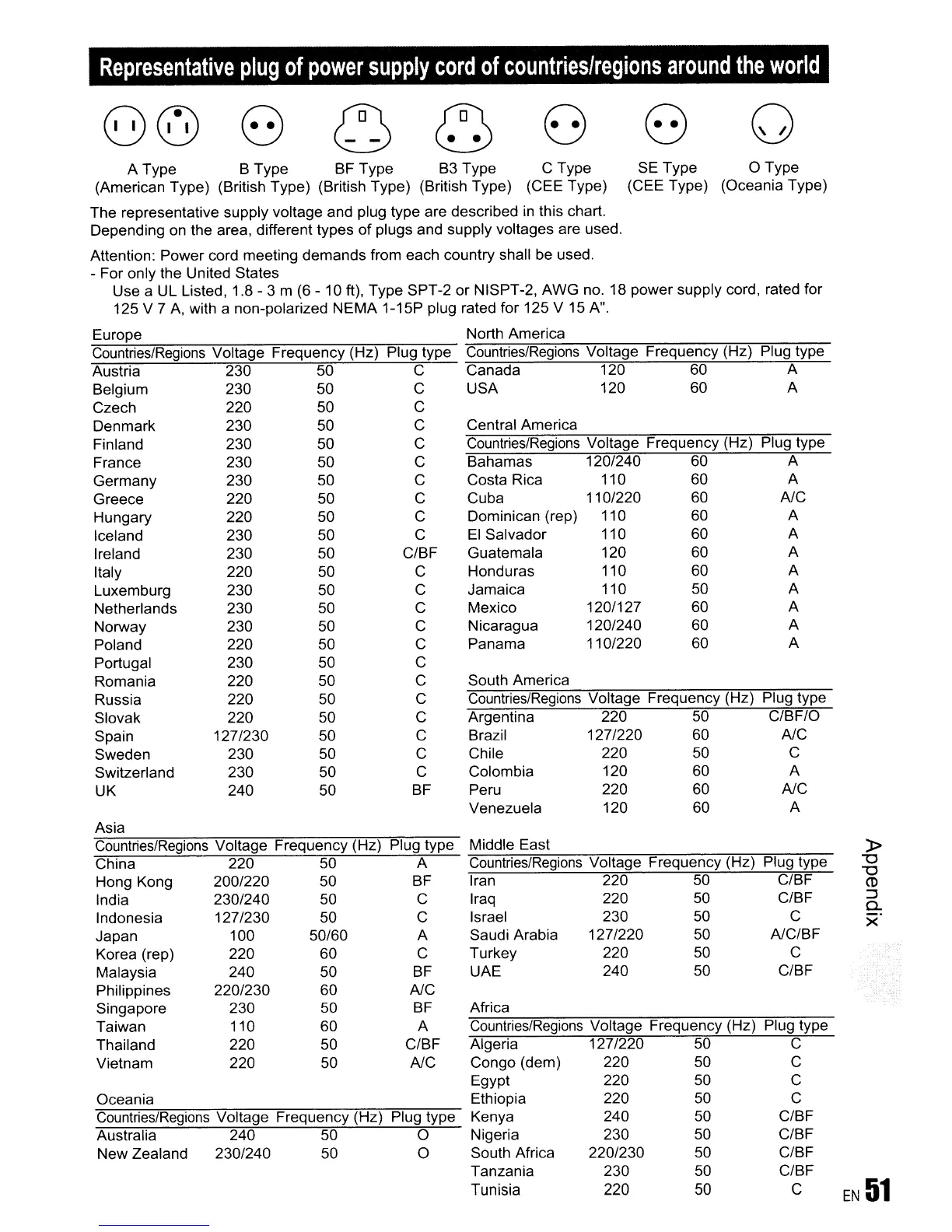 Countries/Regions Voltage Frequency (Hz) Plug type