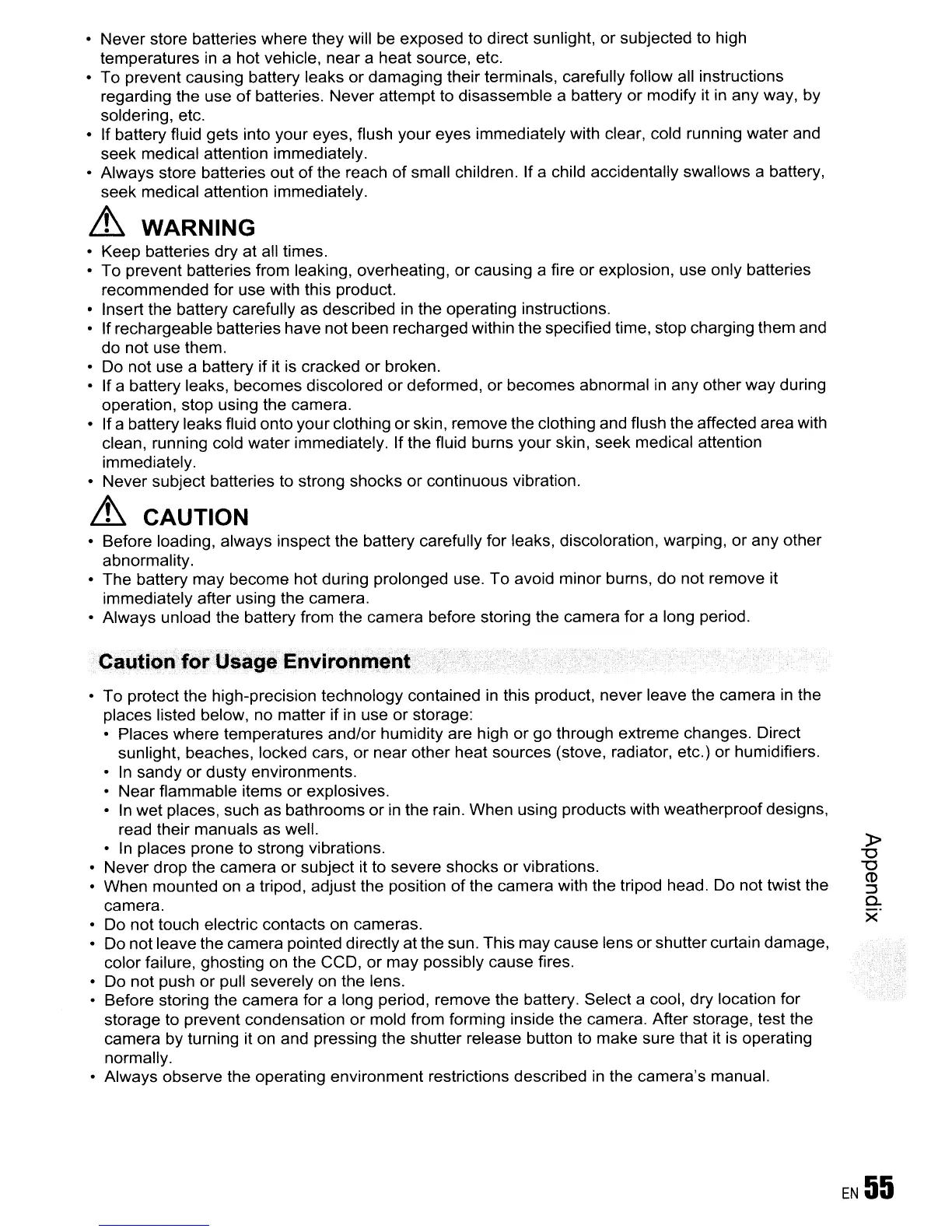 • Never subject batteries to strong shocks or continuous vibration.