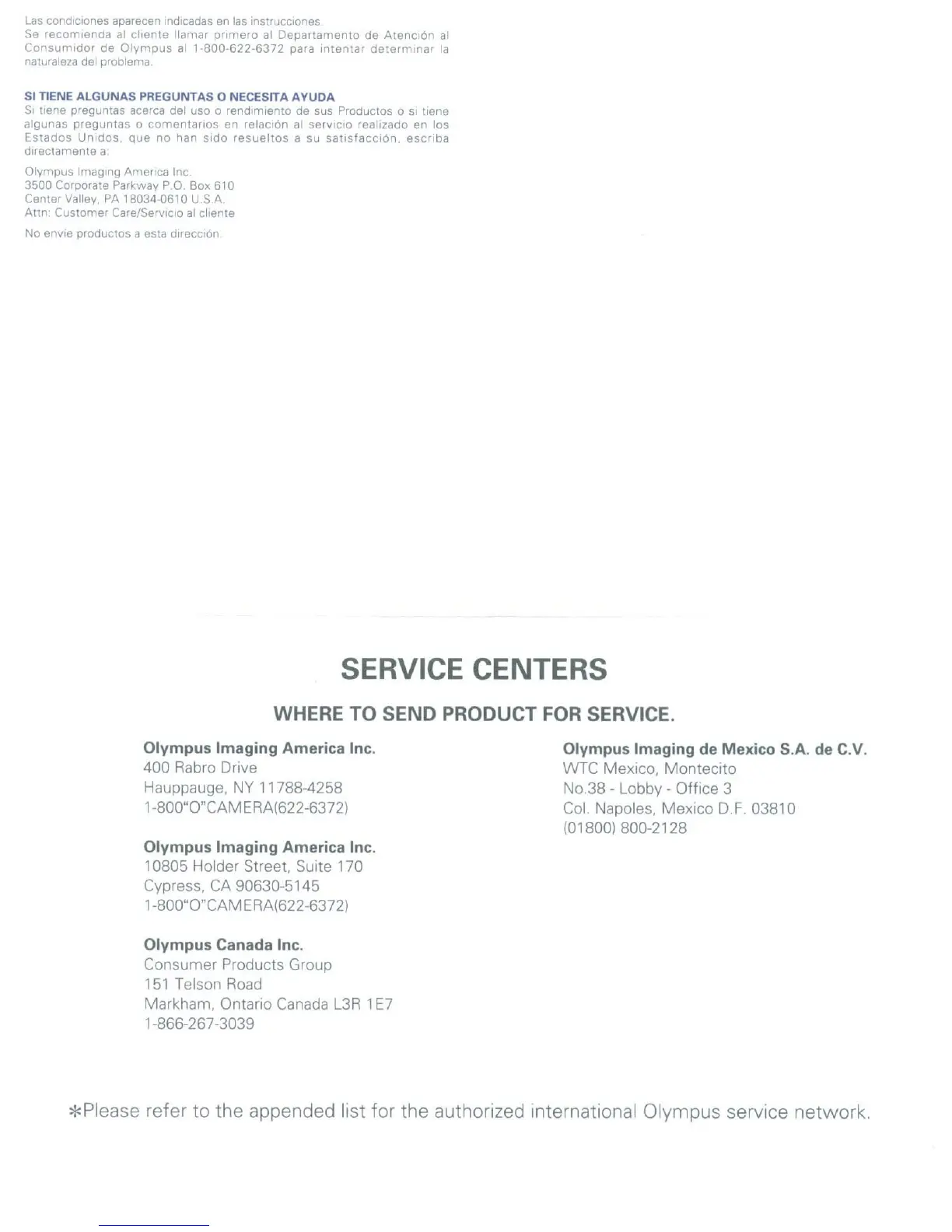 *Please refer to the appended list for the authorized international Olympus service network.