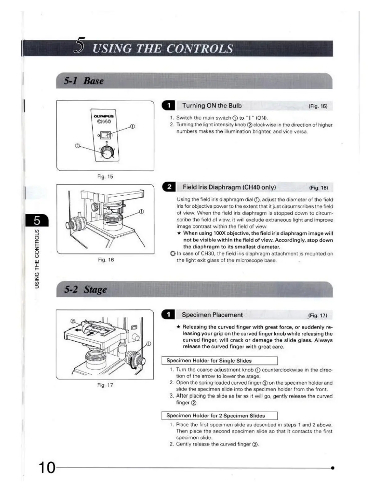 Olympus CH30 - Using the Microscope Controls; Base Controls and Illumination; Stage and Specimen Handling
