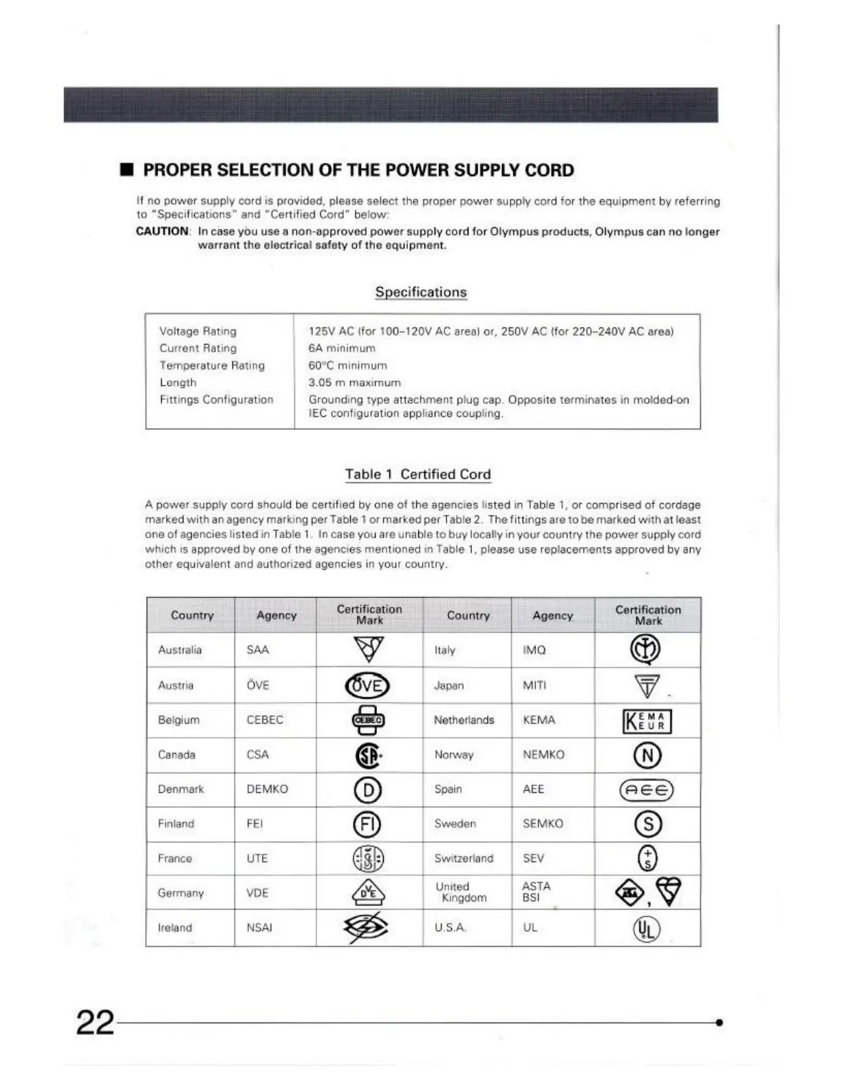 Olympus CH40 - Proper Selection of the Power Supply Cord