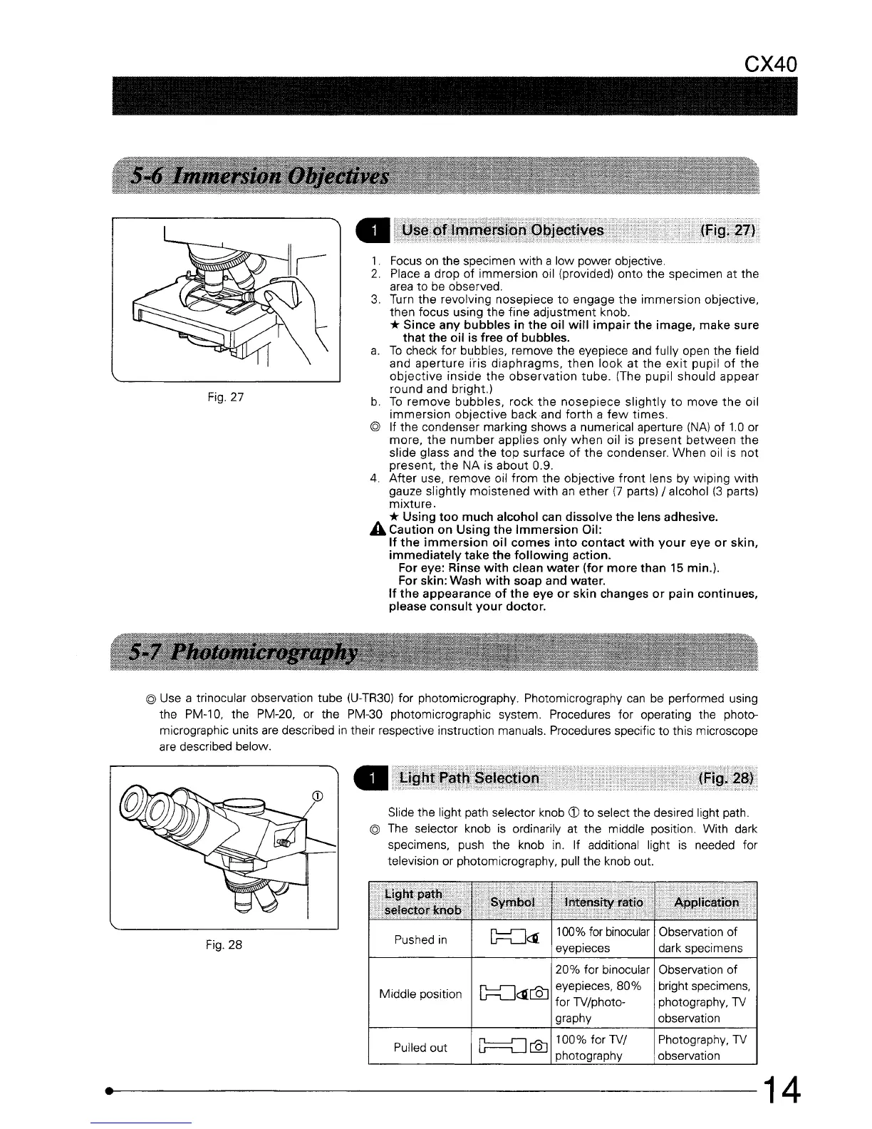 Olympus CX40 - Using the Controls - Immersion Objectives; Using the Controls - Photomicrography