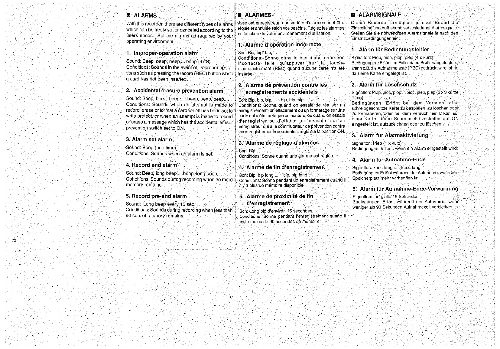 Olympus D1000 - Alarms; Improper Operation Alarm; Accidental Erasure Prevention Alarm; Record Pre-End Alarm