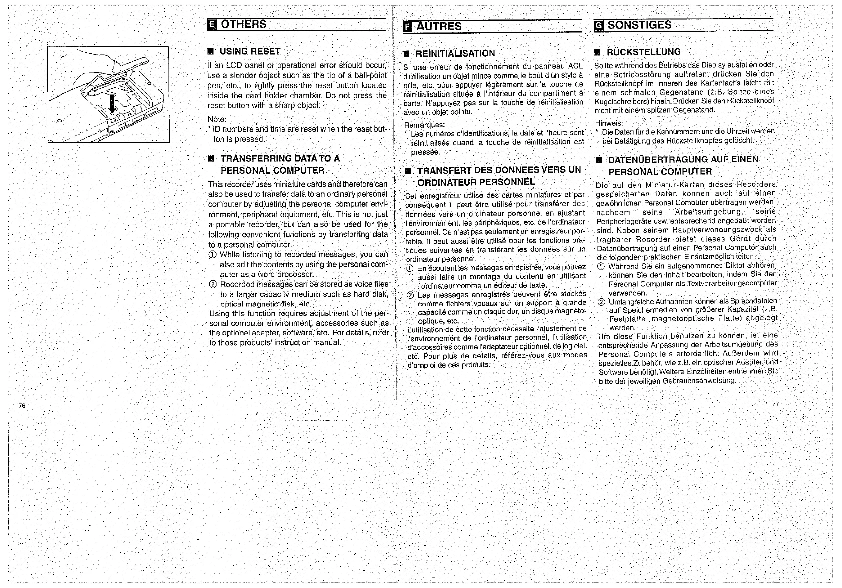 Olympus D1000 - Using Reset; Transferring Data to a Personal Computer