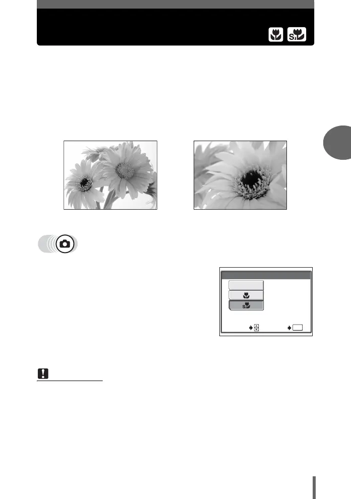 • Lors de la prise de vue en super gros plan, le zoom et le flash ne sont pas