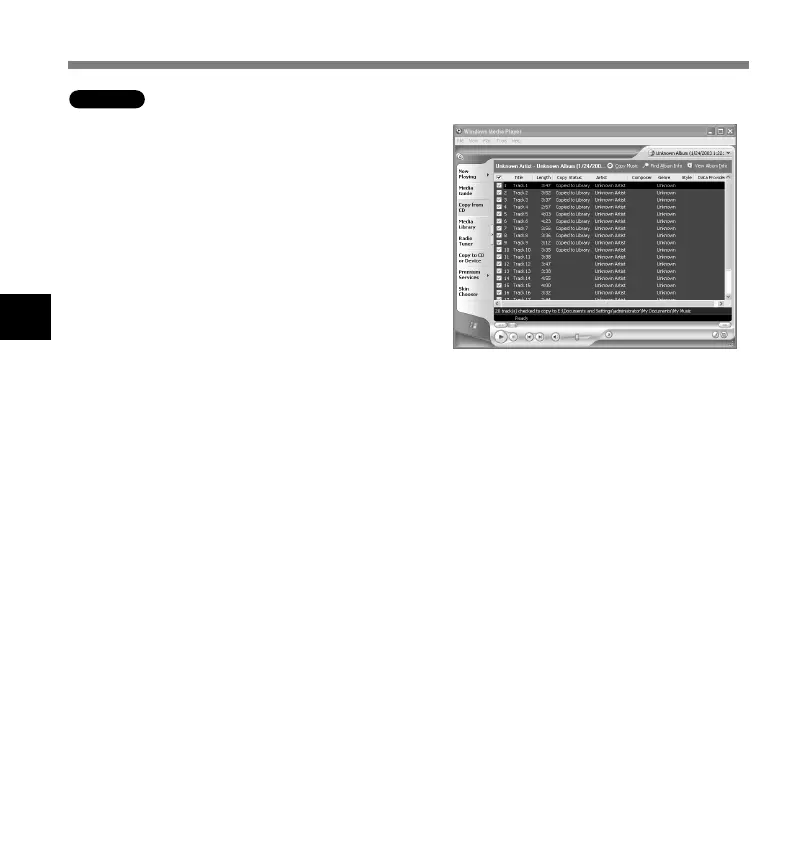 Files copied to a PC are stored in WMA format. Music files copied are categorized by artist,