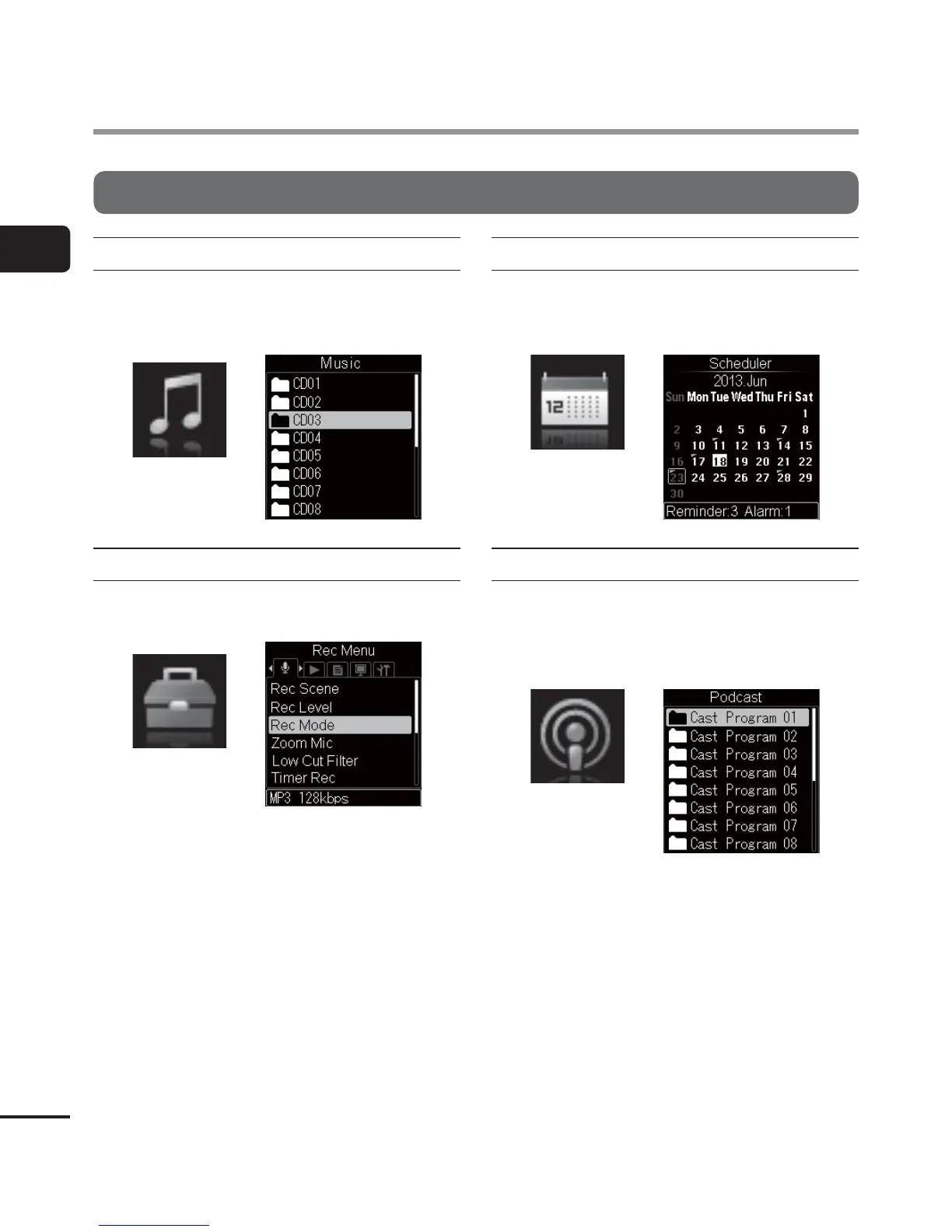 can configure recorder functions (☞P.55).