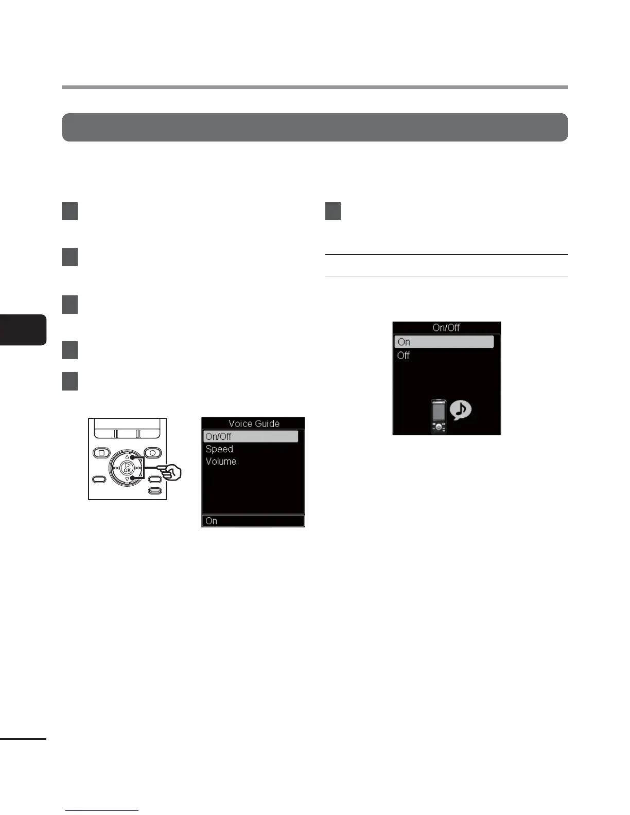 This feature gives voice announcements of recorder operating conditions. You can set voice