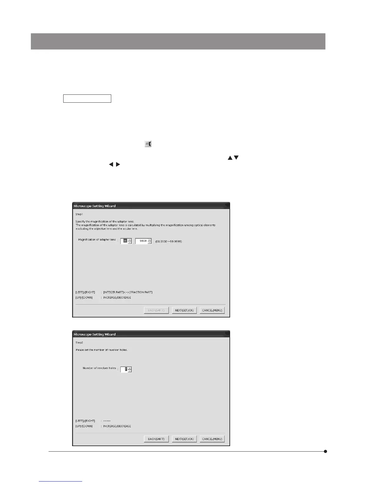 2. Enter the camera adapter magnification, objective power, etc. following the [Microscope Setting Wizard].