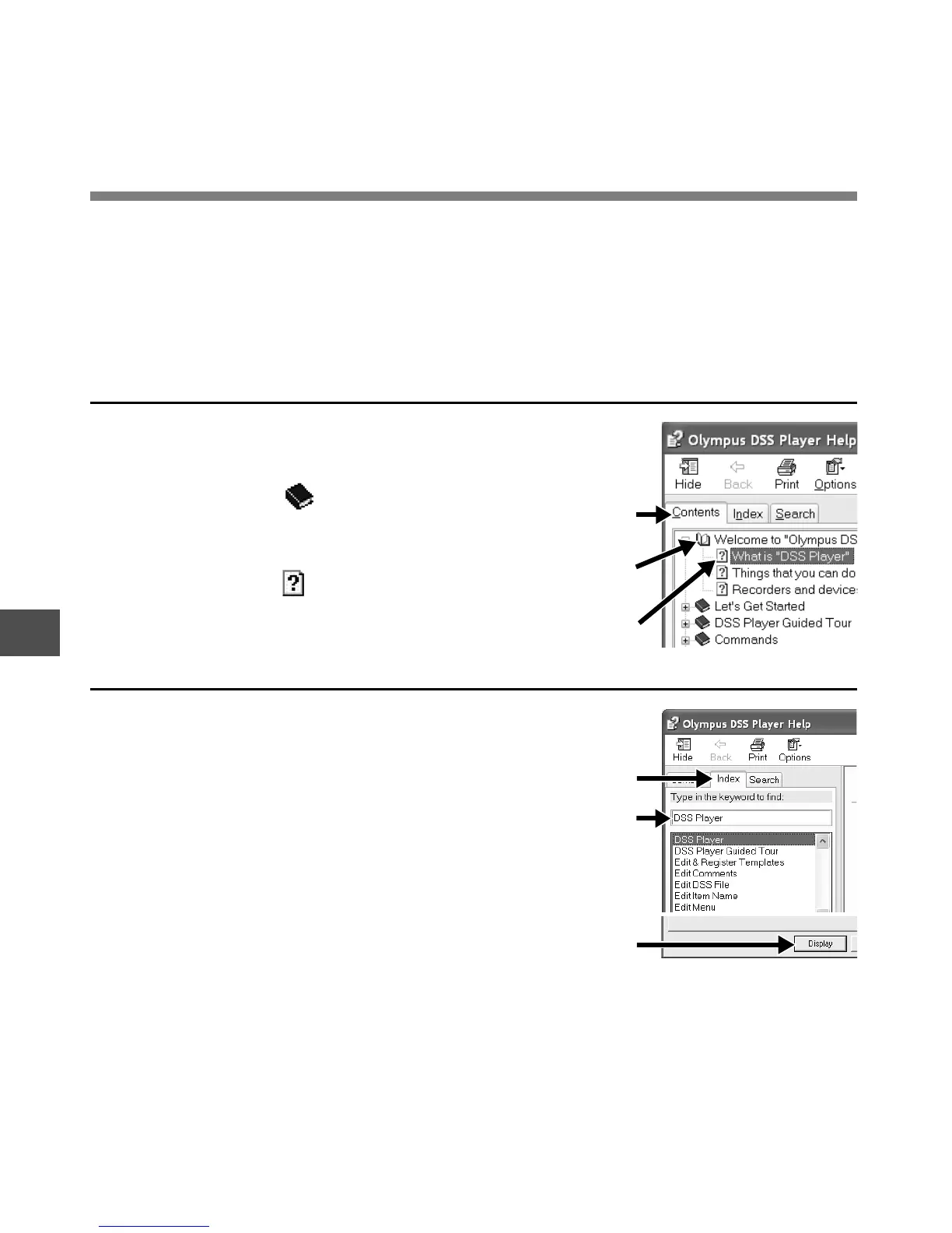 • While DSS Player is running, choose [Contents] from the [Olympus DSS Player Help] menu.