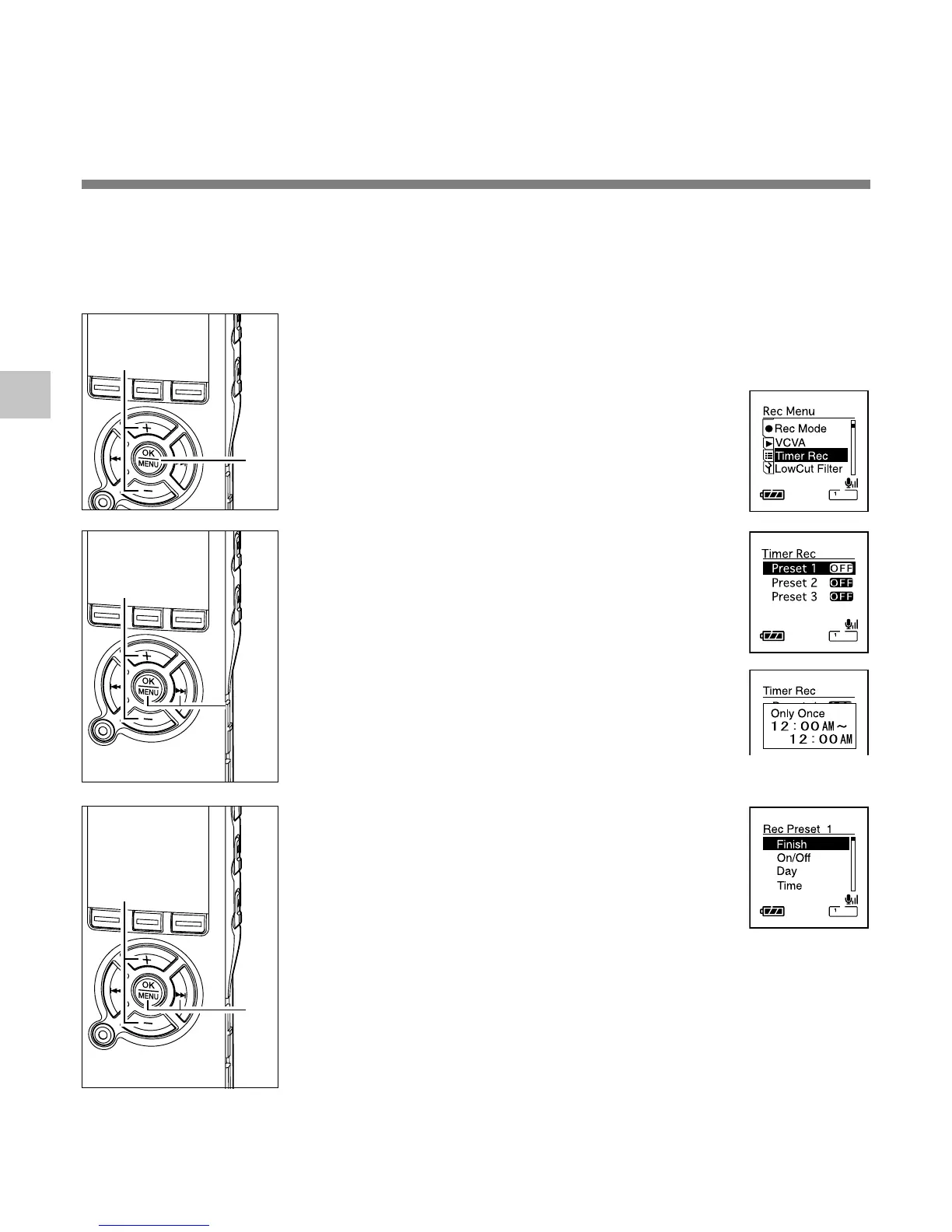 three desired settings (Preset 1-3) (“On/Off”, “Day”, “Time”, “Rec Mode”, “Folder”, and “Mic