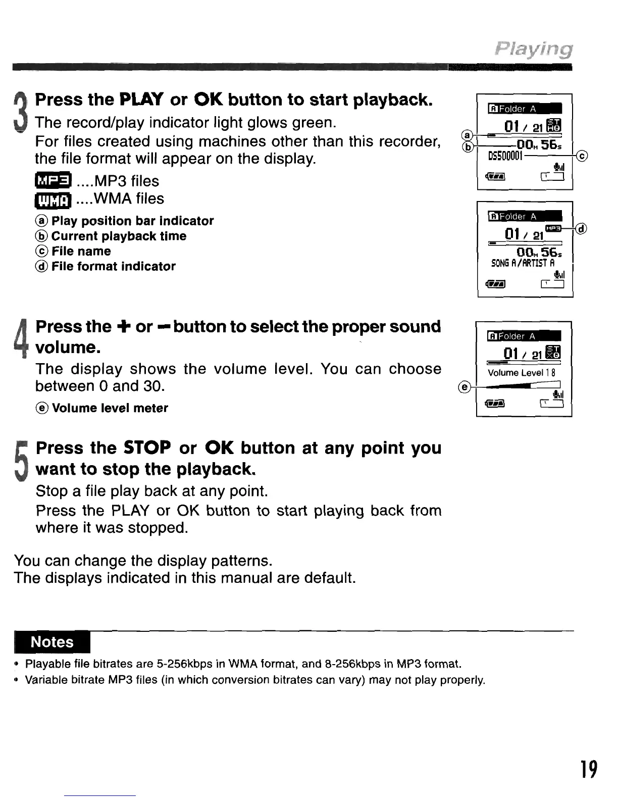 Playable file bitrates are 5-256kbps in WMA format, and 8-256kbps in MP3 format.